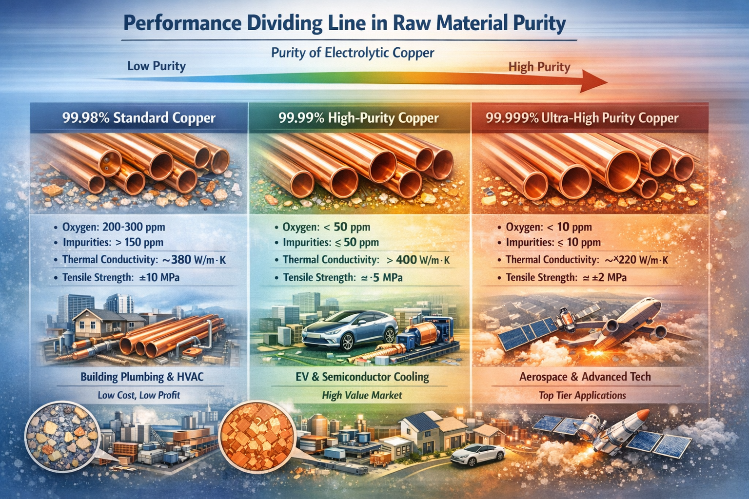 الفرق في النقاء بنسبة 0.01% فقط يمكن أن يعني الفرق بين ملايين الدولارات من الطلبات والمستويات المختلفة لتحديد المواقع في السوق. تعكس هذه التفاصيل التي تبدو بسيطة المنطق الأساسي وراء تحول صناعة أنابيب النحاس في الصين من "التوسع على نطاق واسع" إلى "تحسين الجودة" - حيث تبدأ المنافسة في التصنيع المتطور بالتحكم في المواد الخام من المصدر. الفروق الدقيقة في نقاء المواد الخام ، والتي يتم تضخيمها من خلال عملية الإنتاج، تؤدي في النهاية إلى خلق تفاوت كبير في القدرة التنافسية للمنتجات، لتصبح حاجزًا غير مرئي أمام الشركات التي تدخل السوق الراقية.