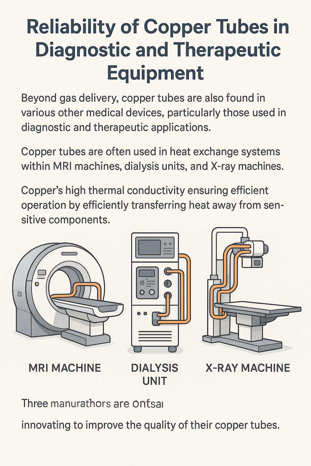 بالإضافة إلى توصيل الغاز، توجد الأنابيب النحاسية أيضًا في العديد من الأجهزة الطبية الأخرى، خاصة تلك المستخدمة في التطبيقات التشخيصية والعلاجية . على سبيل المثال، غالبا ما تستخدم الأنابيب النحاسية أنظمة التبادل الحراري ضمن المعدات الطبية مثل أجهزة التصوير بالرنين المغناطيسي، ووحدات غسيل الكلى، وأجهزة الأشعة السينية. تضمن الموصلية الحرارية العالية للنحاس أن تعمل هذه الآلات بكفاءة وأمان عن طريق نقل الحرارة بكفاءة بعيدًا عن المكونات الحساسة.