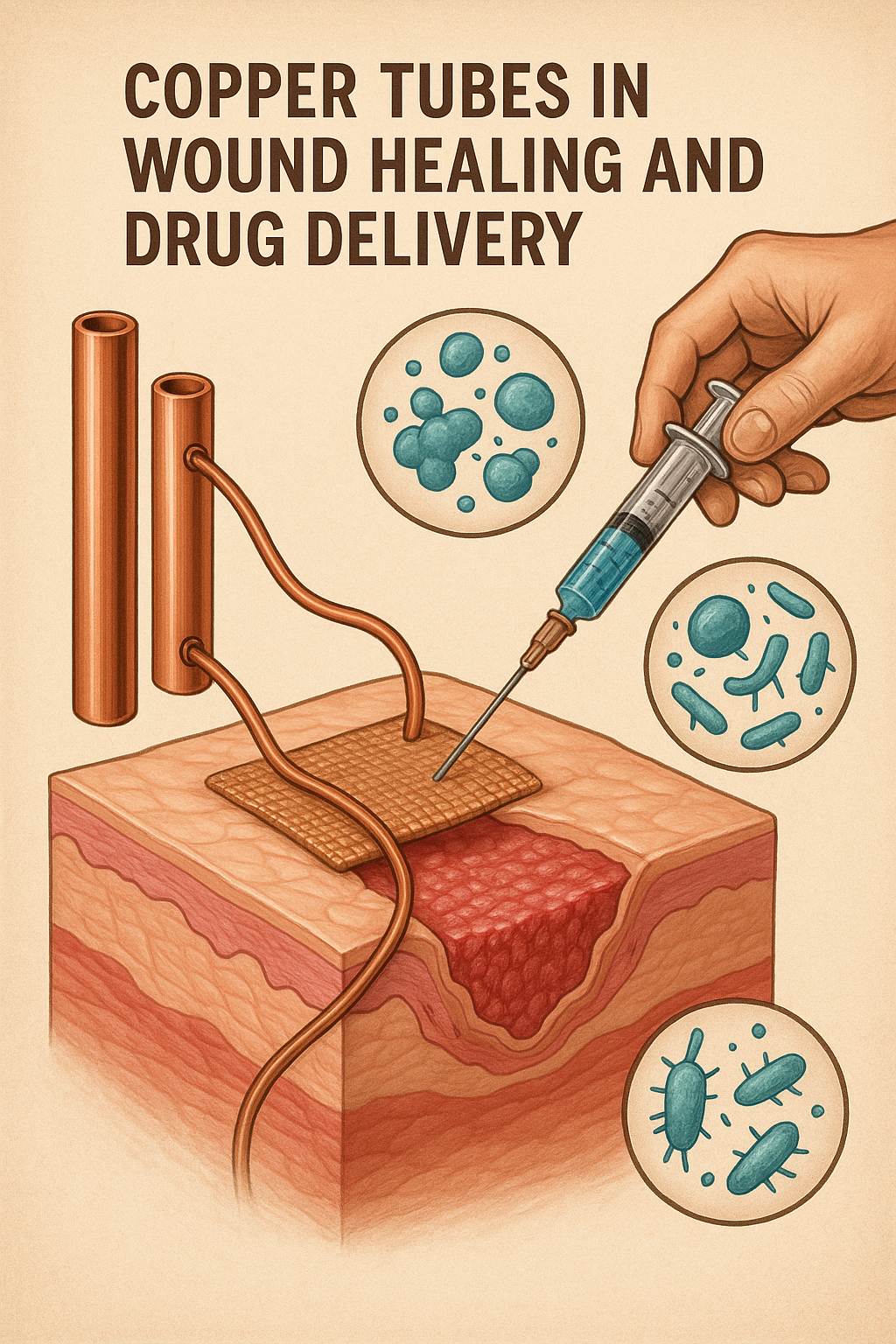 تكتسب الضمادات المملوءة بالنحاس، والتي غالبًا ما يتم دمجها مع أنابيب النحاس النقي، شعبية كوسيلة لتقديم العلاج الموضعي. وقد وجد أن هذه الضمادات تقلل من خطر العدوى وتعزز الشفاء بشكل أسرع، مما يجعلها أداة مهمة في علاج الجروح المفتوحة، وتقرحات السكري، والشقوق الجراحية.