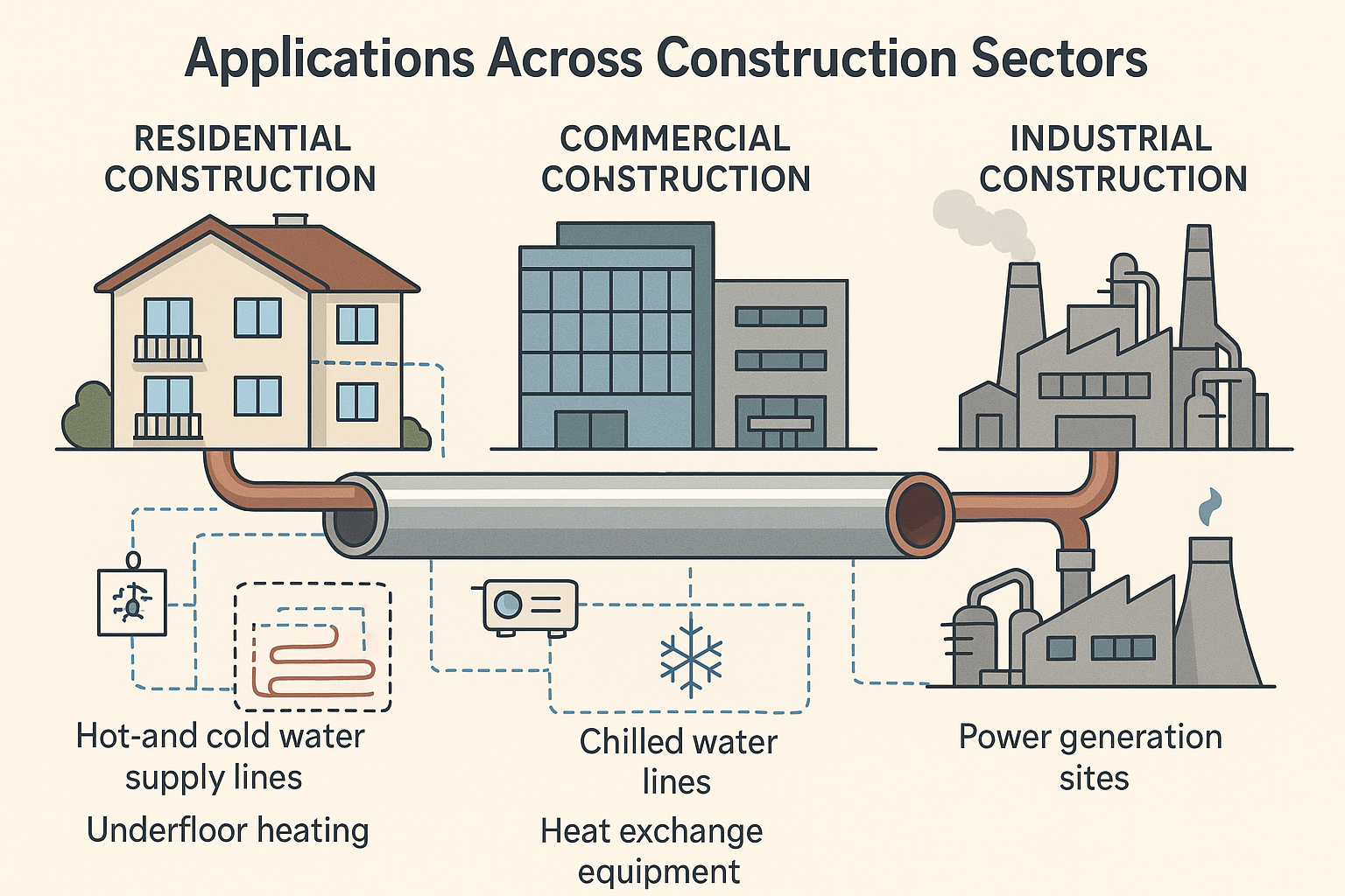 تعدد الاستخدامات الفضة copper tubes يجعلها مناسبة لمجموعة واسعة من تطبيقات البناء . في البناء السكني ، وهي شائعة الاستخدام في خطوط إمدادات المياه الساخنة والباردة , أنظمة التدفئة ، و شبكات التدفئة تحت البلاط . تساعد متانتها على تقليل مخاطر التسربات والفشل المرتبط بالتآكل، وهو أمر مهم بشكل خاص في المباني السكنية متعددة الوحدات .