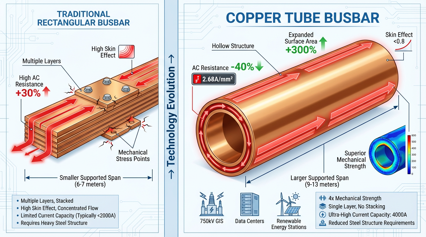 تعالج هذه الثورة الهيكلية بشكل مباشر نقاط الألم في انتقال التيار العالي للغاية. في مجموعة المفاتيح الكهربائية المعزولة بالغاز 750 كيلو فولت (GIS)، يمكن لقضيب توصيل الأنبوب النحاسي Φ100×5mm أن يحمل تيارًا يبلغ 4000 أمبير، مع كثافة تيار تبلغ 2.68 أمبير/مم² فقط. في المقابل، تتطلب قضبان التوصيل المستطيلة المكافئة طبقات مكدسة متعددة مما أدى إلى زيادة الخسارة بنسبة تزيد عن 30٪. والأهم من ذلك، أن القوة الميكانيكية لقضبان التوصيل ذات الأنابيب النحاسية تبلغ أربعة أضعاف قوة قضبان التوصيل المستطيلة. تحت تأثير تيار الدائرة القصيرة 50 كيلو أمبير، يصل الامتداد المعلق إلى 9 أمتار، ويمتد الامتداد المدعوم إلى 13 مترًا، مما يقلل بشكل كبير من الحاجة إلى الهياكل الفولاذية للمحطات الفرعية.