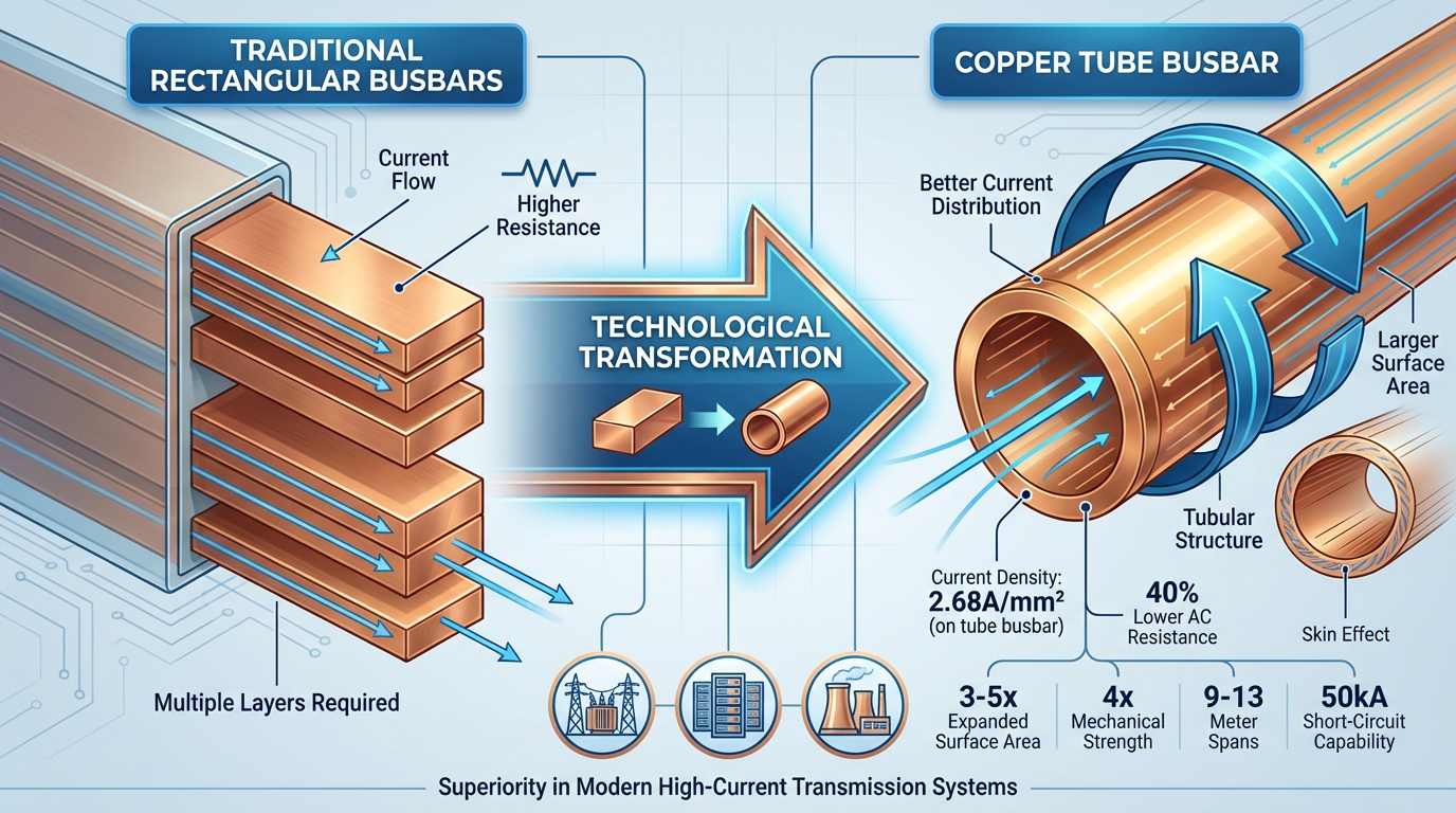 يؤدي تحديث البنية التحتية العالمية للطاقة إلى زيادة الطلب غير المسبوق على الطاقة أنبوب النحاس أشرطة التوصيل. على الرغم من أنها تمثل 2% إلى 3% فقط من إجمالي الطلب على أنابيب النحاس، إلا أن هذه المنتجات تشهد معدلات نمو تتجاوز 200% سنويًا في تطبيقات مثل المحطات الفرعية ذات الجهد العالي للغاية ومراكز البيانات ومحطات الطاقة الجديدة. الميزة الأساسية تكمن في هيكل أنبوبي مجوف ، الذي يوسع مساحة سطح الموصل بمقدار 3-5 مرات، ويضمن توزيعًا منتظمًا للتيار على طول جدار الأنبوب، ويقلل من معامل تأثير الجلد إلى أقل من 0.8، ويقلل من مقاومة التيار المتردد بنسبة 40% مقارنة بقضبان التوصيل المستطيلة ذات مساحة المقطع العرضي المكافئة.