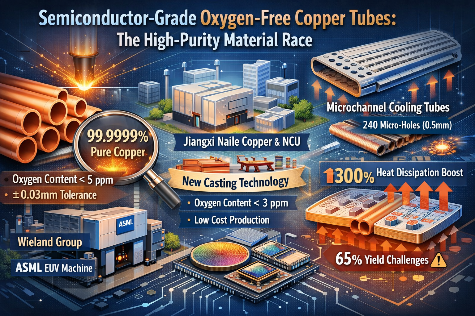 ترقية معدات تصنيع أشباه الموصلات يتطلب معايير النقاء الشديد ل أنابيب النحاس . بحلول عام 2025، تتطلب الأنابيب النحاسية الخالية من الأكسجين من فئة أشباه الموصلات محتوى أكسجين أقل من 5 جزء في المليون وتحمل سمك الجدار بمقدار ±0.03 مم. وتبلغ الطاقة الإنتاجية العالمية لمثل هذه المنتجات أقل من 10000 طن، ومع ذلك فهي تستحوذ على أكثر من 60% من أرباح السوق الراقية. على سبيل المثال، تستخدم الأنابيب النحاسية لنظام التبريد في آلات الطباعة الحجرية بالأشعة فوق البنفسجية الخاصة بشركة ASML، والتي يتم توفيرها حصريًا من قبل مجموعة Wieland Group الألمانية، تقنية ذوبان المنطقة العائمة بشعاع الإلكترون لتحقيق نقاء النحاس بنسبة 99.9999%، مما يؤدي إلى أسعار أعلى بـ 80 مرة من أنابيب النحاس العادية.