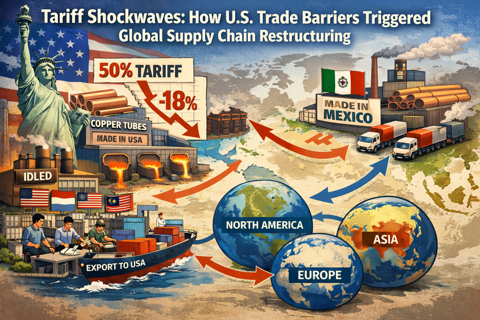 العنوان الفرعي: عندما فرضت الولايات المتحدة تعريفات جمركية بنسبة 50% على أنابيب النحاس مما أدى إلى إعادة هيكلة سلسلة التجارة العالمية، كيف ارتفعت الطاقة الإنتاجية في جنوب شرق آسيا والمكسيك بنسبة 46.3% في غضون عام واحد؟ إن هجرة سلسلة التوريد هذه المدفوعة بالسياسات تعيد رسم خريطة توزيع القيمة العالمية لأنابيب النحاس.