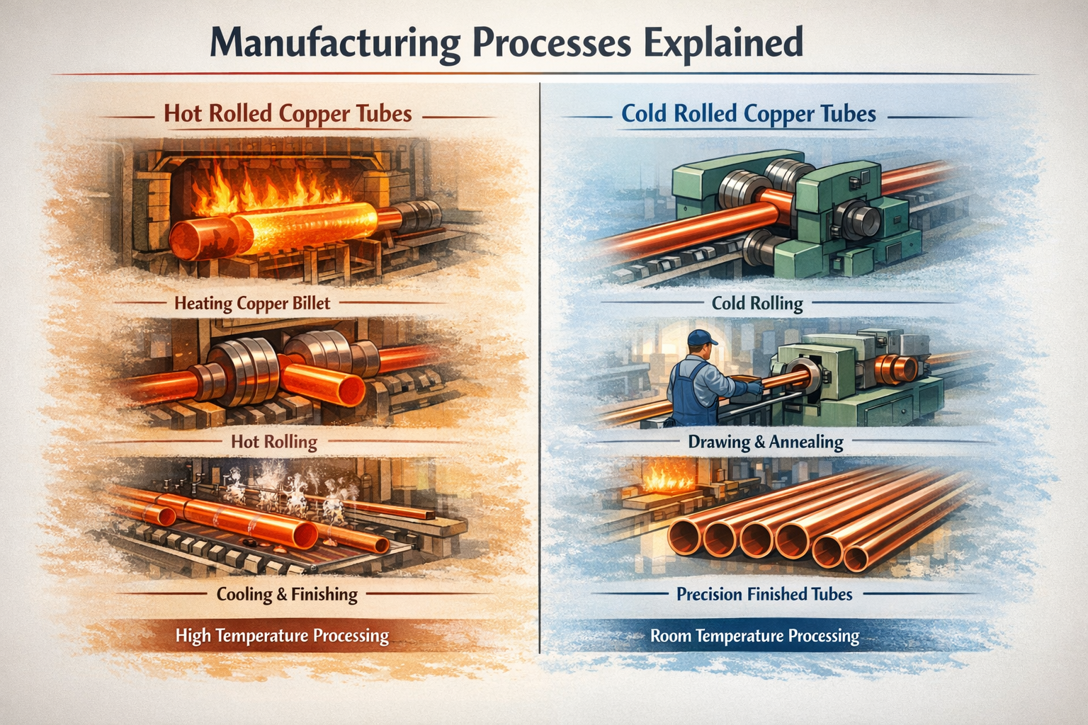 أنابيب النحاس المدرفلة على الساخن يتم إنتاجها عن طريق تسخين قضبان النحاس فوق درجة حرارة إعادة البلورة ولفها إلى أشكال أنبوبية. في درجات الحرارة المرتفعة، يصبح النحاس أكثر قابلية للاستخدام، مما يسمح بالتشكيل الفعال والإنتاج العالي. بعد التدحرج، يتم تبريد الأنابيب ويمكن أن تخضع لعمليات التشطيب الأساسية.