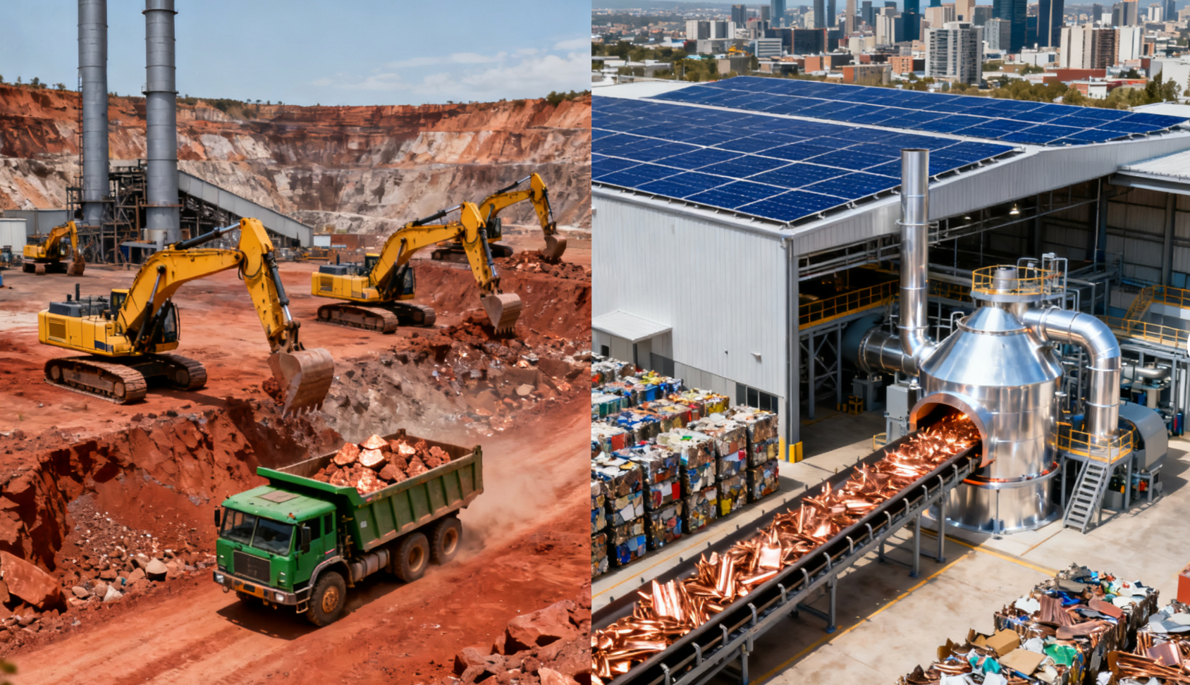 (التسمية التوضيحية: الانقسام الأساسي: يمثل استخراج الموارد (الاقتصاد الخطي) مقابل تجديد الموارد (الاقتصاد الدائري) رؤى متعارضة لمستقبل إنتاج أنابيب النحاس.)