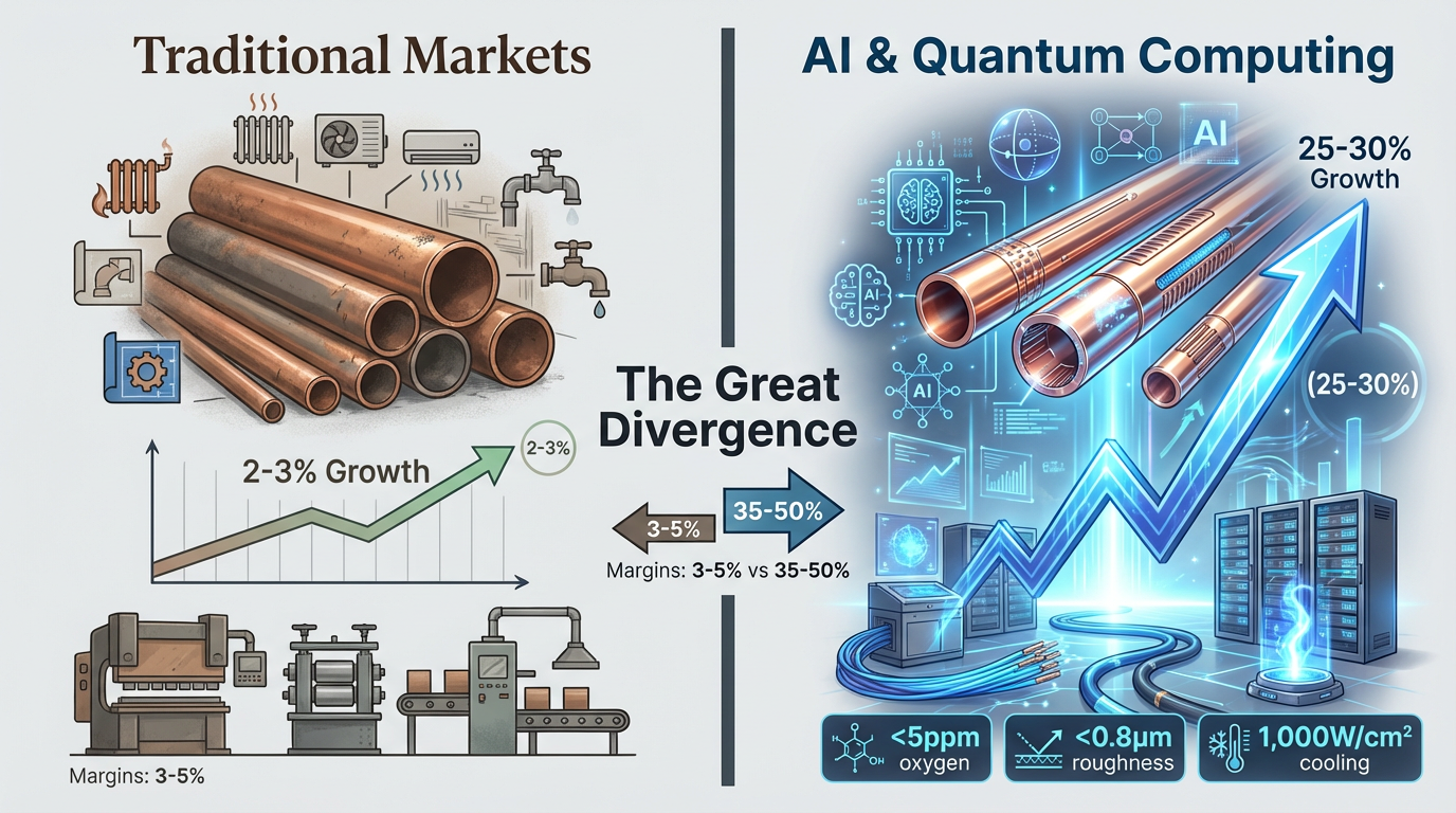 العالمية أنبوب النحاس وتشهد الصناعة تجزئة غير مسبوقة. بينما البناء التقليدي و تطبيقات التدفئة والتهوية وتكييف الهواء ينمو الطلب بنسبة متواضعة تتراوح بين 2-3% سنويًا أنابيب دقيقة في تصنيع أشباه الموصلات، والبنية التحتية للذكاء الاصطناعي، والحوسبة الكمومية، ترتفع بنسبة 25% إلى 30% سنويا. ويؤدي هذا الاختلاف إلى إنشاء سوق ذات مستويين: يناضل منتجو المنتجات السائبة مع هامش ربح يتراوح بين 3% إلى 5%، في حين يحصل المصنعون المتخصصون على هامش إجمالي يتراوح بين 35% إلى 50% للأنابيب التي تلبي المواصفات القصوى.