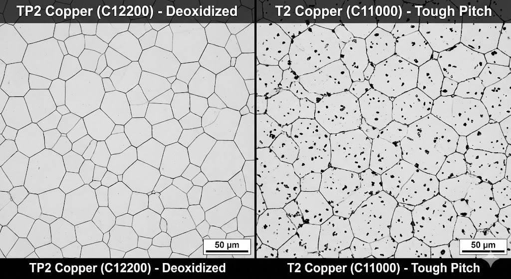 تكمن الأهمية الأساسية للنحاس TP2 في قابلية اللحام . يحتوي النحاس التقليدي "الصلب" (مثل T2) على كميات ضئيلة من الأكسجين. عندما يتم تسخين T2 أو لحامه في جو غني بالهيدروجين، فإنه يعاني من "التقصف الهيدروجيني"، مما يؤدي إلى شقوق مجهرية وفشل هيكلي.