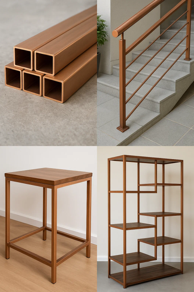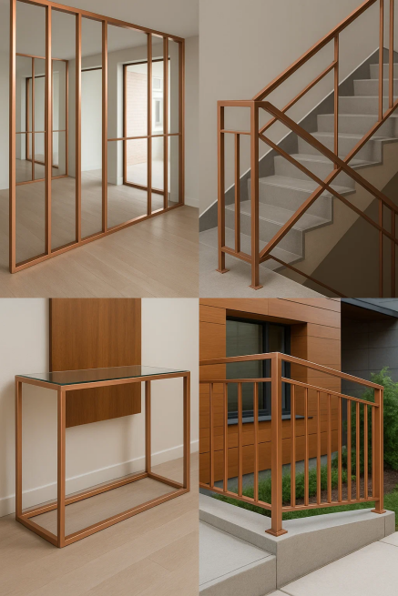 في بعض الحالات، يتم دمج الأنابيب النحاسية المربعة مع مواد أخرى مثل الزجاج أو الخشب لإنشاء تصميمات فريدة وديناميكية تتلاعب بالملمس والضوء. يمكن استخدامها في كل من الإعدادات الحديثة والبسيطة بالإضافة إلى التصميمات التقليدية، مما يوضح مرونتها في التكيف مع الأنماط المختلفة.