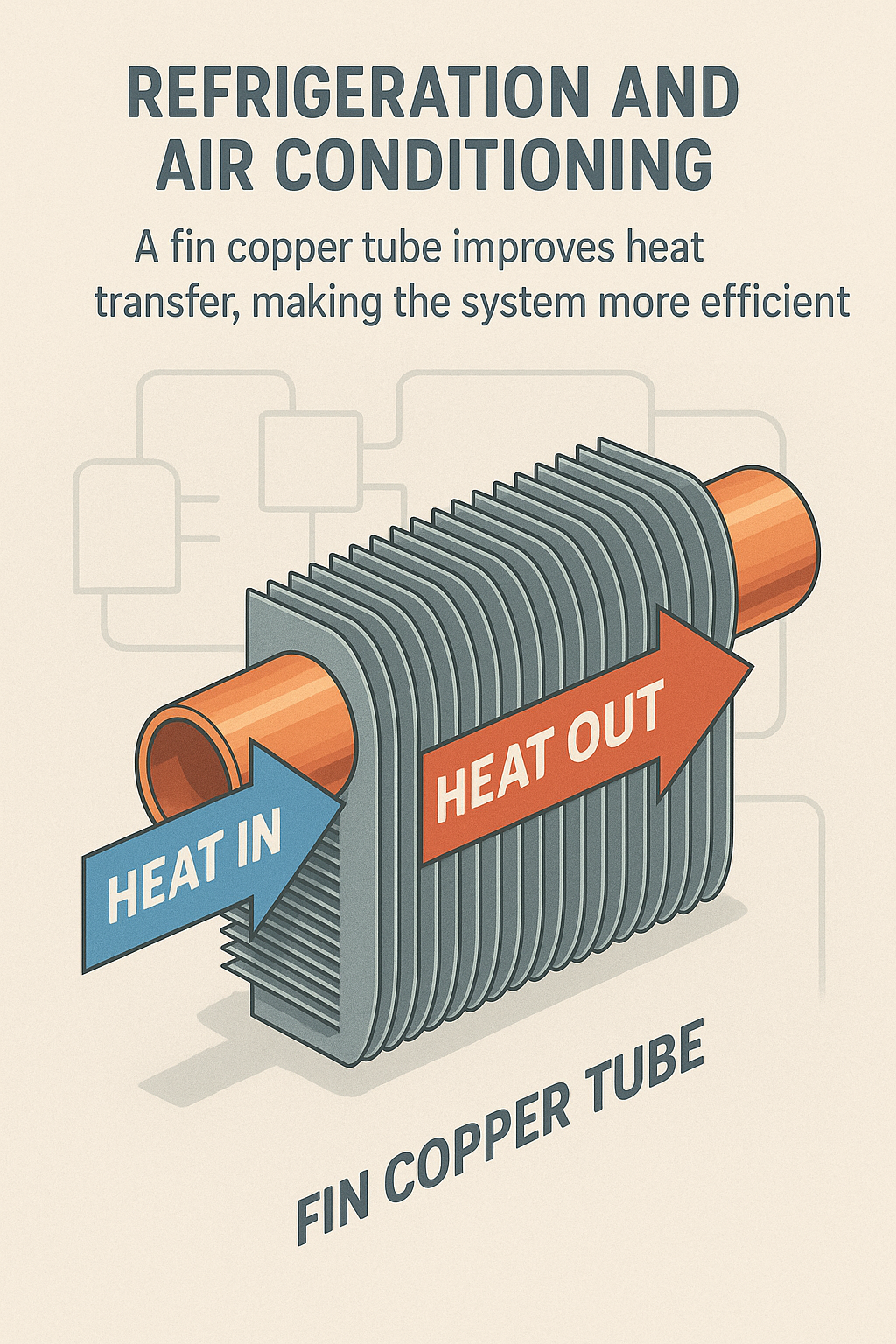 في أنظمة تكييف الهواء، تُستخدم أنابيب النحاس ذات الزعانف على نطاق واسع في ملفات المبخر والمكثف. يمتص المبخر الحرارة من الهواء داخل المبنى، بينما يقوم المكثف بإطلاق الحرارة إلى البيئة الخارجية. يؤدي استخدام أنابيب النحاس ذات الزعانف في كل من هذه المكونات إلى تحسين كفاءة نقل الحرارة بشكل عام، مما يؤدي إلى أداء تبريد أفضل واستهلاك أقل للطاقة.