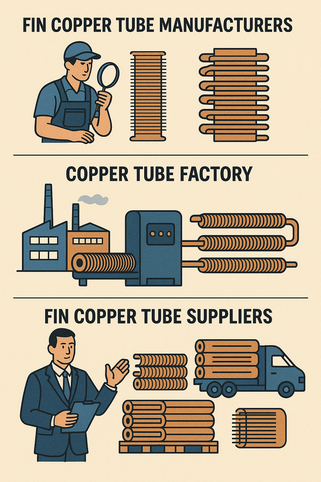 أدى الطلب المتزايد على أنابيب النحاس ذات الزعانف في صناعات التبريد وتكييف الهواء إلى ارتفاع عددها أنبوب النحاس الزعانف Manufacturer و مصنع أنابيب النحاس . يلعب هؤلاء المصنعون والمصانع دورًا حيويًا في إنتاج وتوزيع أنابيب النحاس ذات الزعانف.